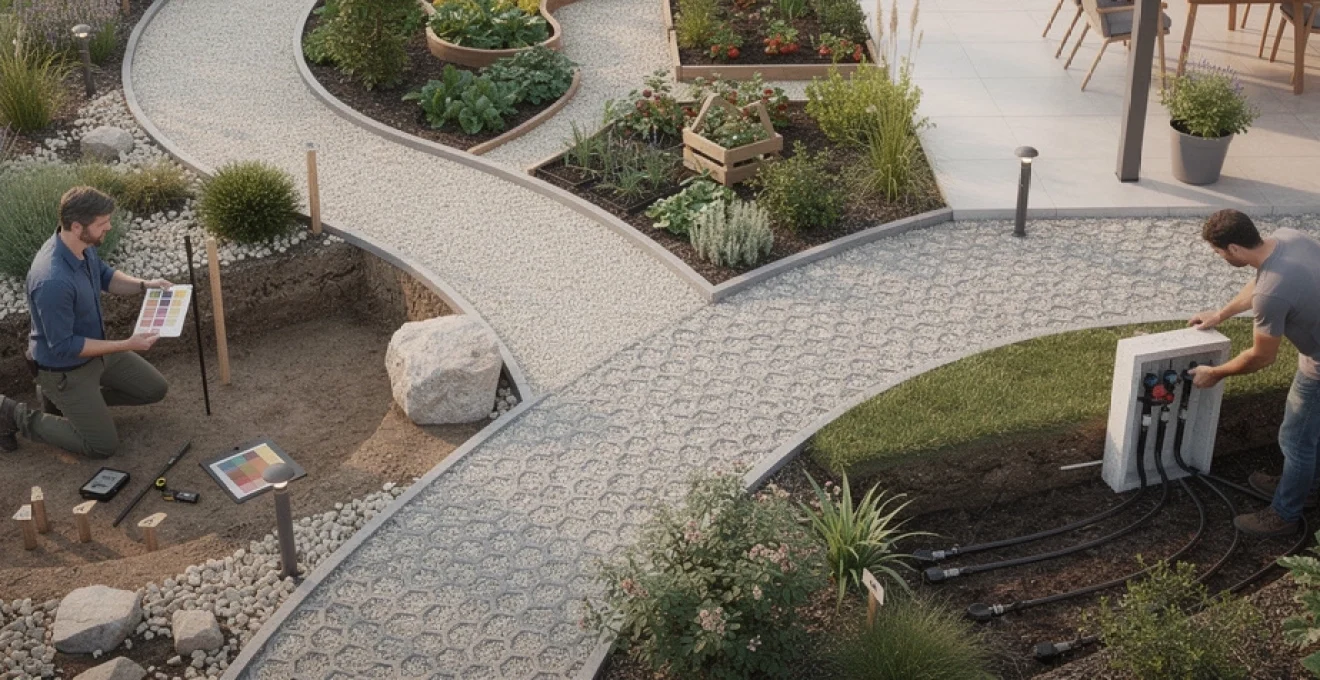 Pour matérialiser ce schéma, tracez les axes principaux (allée d’entrée, cheminement vers le fond du jardin) puis les chemins secondaires. Variez les largeurs : 1,20 m pour deux personnes de front sur les allées principales, 80 à 90 cm pour les passages plus intimistes. Des revêtements différenciés (dalles, gravier stabilisé, pas japonais) aident à hiérarchiser ces circulations. Vous pouvez également utiliser la végétation comme guide : une haie basse, un alignement de vivaces ou une rangée de graminées accompagnent le regard et invitent à la promenade.
